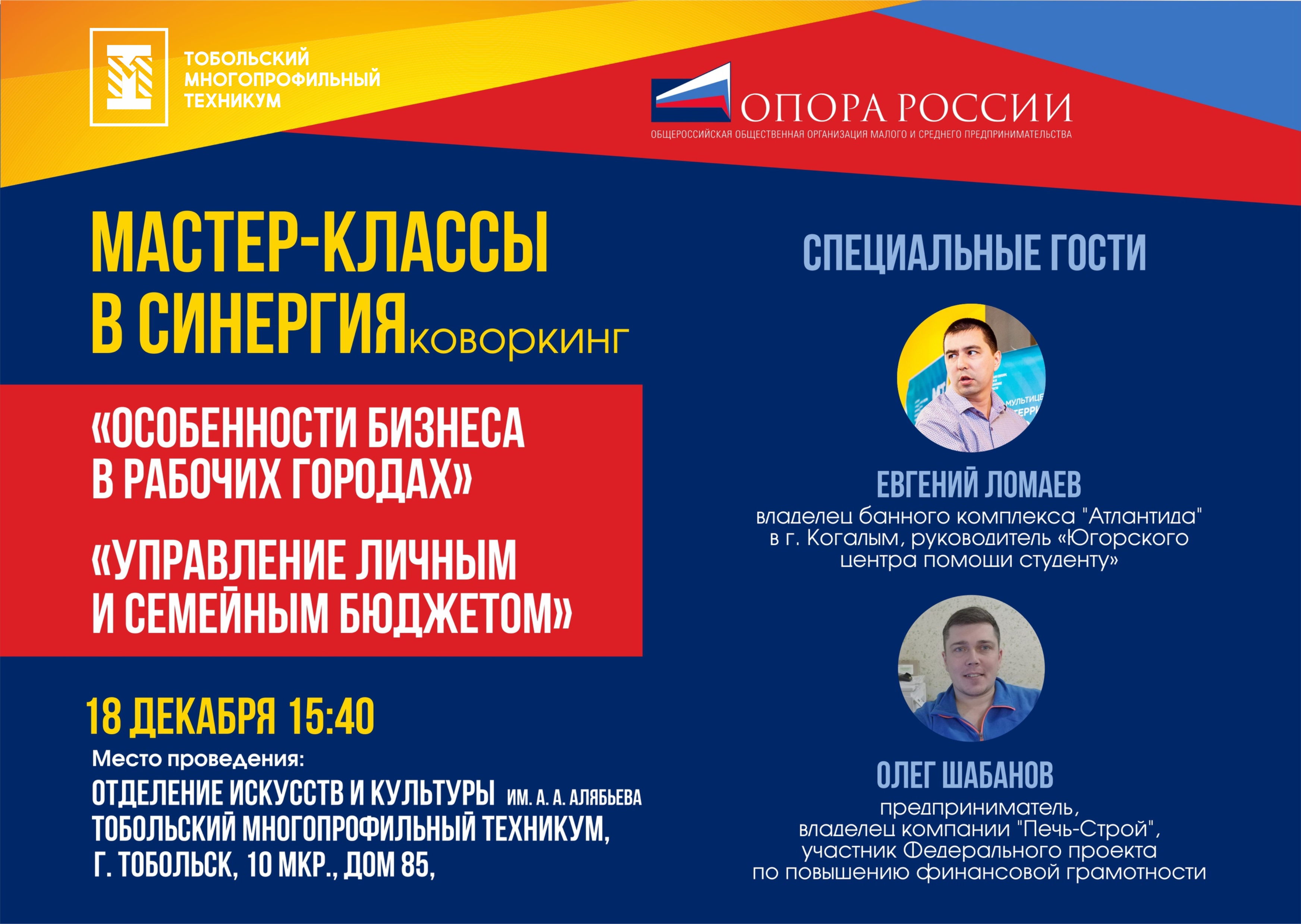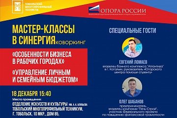 Сегодня, 18 декабря 2018 г. в студенческом центре "Точка Опоры" Отделения искусств и культуры им. А.А. Алябьева Тобольского многопрофильного техникума прошли мастер-классы предпринимателей Евгения Ломаева и Олега Шабанова на темы «Особенности бизнеса в рабочих городах» и «Управление личным и семейным бюджетом».
