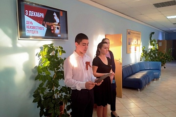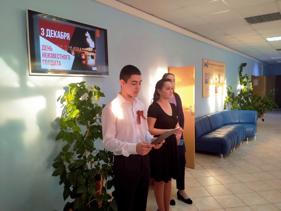 В Тюменском техникуме строительной индустрии и городского хозяйства (отделение на Игримской) прошли мероприятия, посвященные памятной дате - Дню неизвестного солдата. В актовом зале, для студентов групп МДР-20-9-1 и ЭМР-18-9-1, прошел урок мужества «Имя твоё неизвестно, подвиг твой бессмертен», который подготовили преподаватель русского языка и литературы Синева А.В. и педагог-организатор Рябикова Н.М.
